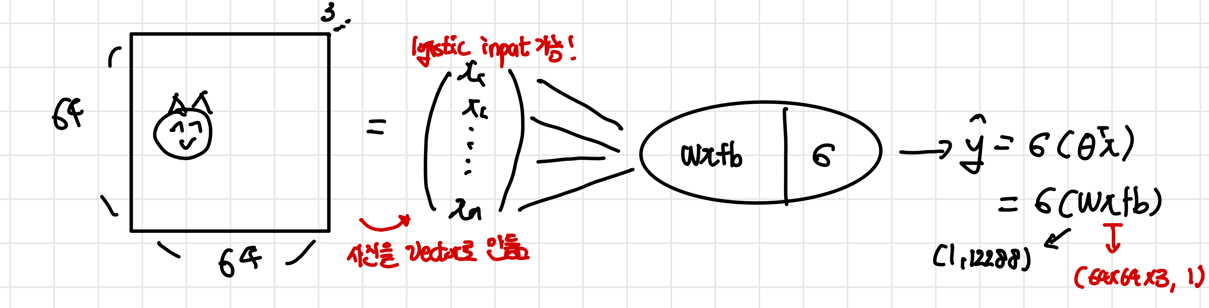input image가 64X64X3의 크기(픽셀)을 가지고 있을 때 이를 vector로 만들어준다. vector로 만들어야지만 logistic regression에 input으로 들어갈 수 있기 때문이다. 이 값을 특정 weight와 곱해준 후 이 값을sgimoid 를 이용해 값을 0과 1 사이로 만든다.(logistic regression이 classification에 사용) 이때 logistic regression에서 를 이용해 hypothesis를 만들었지만 여기서는 이 값들의 집합인 weight w()로 표현을 한다. 참고로 이때 w의 size는 (1,64X64X3)이 되는데 sigmoid의 input은 하나의 실수 값이어야하기 때문이다.