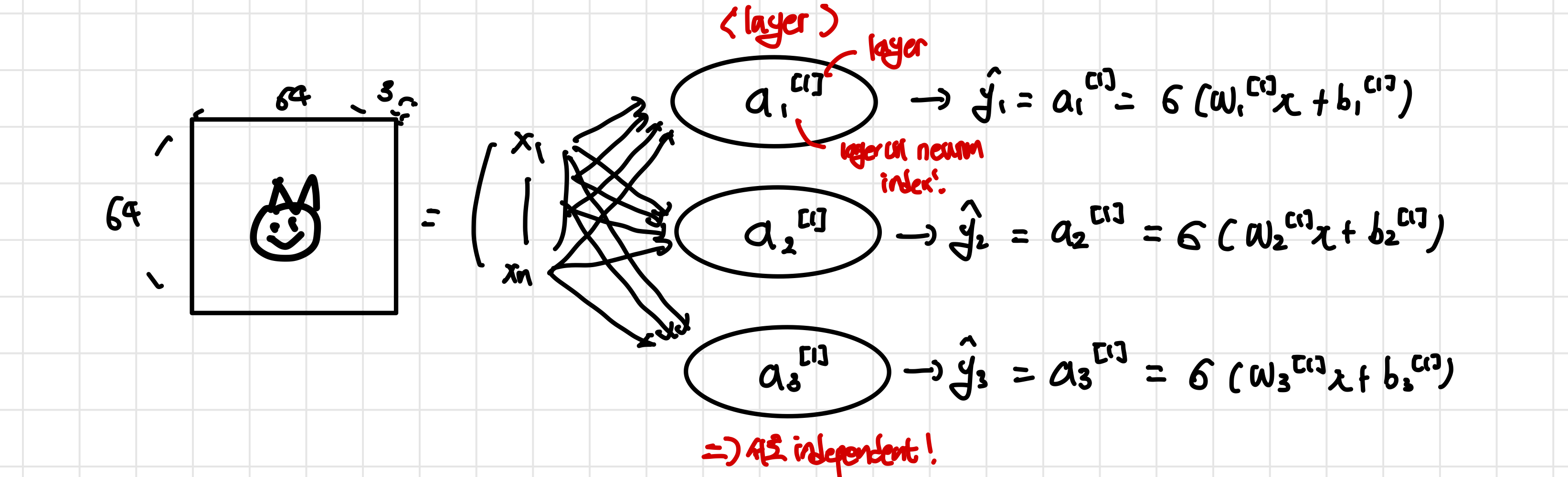 이와 같은 모델에서 output은 더 이상 특정 실수가 아닌 vector(여기서는 prediction을 진행하는 가 3개이기 때문에 크기가 3인 vector)가 되고 각각의 neuron은 고유한 parameter을 가지기 때문에 parameter의 개수는 (12288+1)X3이 된다