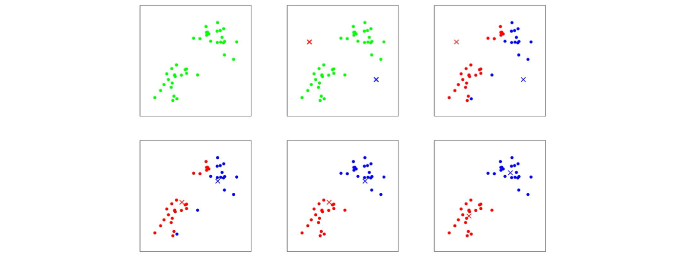 동작방식은 맨 처음에 k개의 점을 잡은 후 이를 cluster centroid라고 두고 각각의 training example을 지나가며 가장 가까운 centroid의 색으로 칠한다.(가장 가까운 centroid의 군집이 된다) 이후 각각의 cluster(군집)의 평균이 되는 곳이 다시 centroid가 되고 이 과정을 하나의 결과로 수렴(converge)될 때까지 반복한다. 참고로 가깝다는 것은 기하학적인 거리가 가깝다는 것을 의미한다