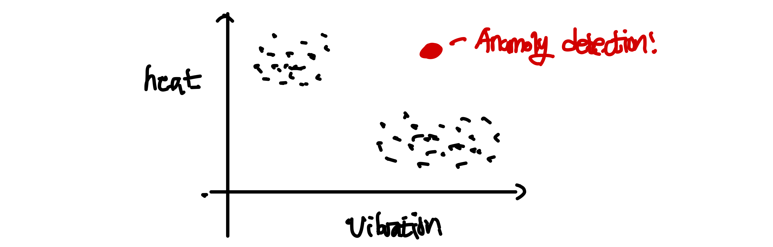 예를 들어 비행기 정비를 하는데 이때 중요한 feature를 heat와 vibration이라고 하자. 이때 아래와 같이 분포를 가질 때 빨간색 점이 이상치(anamoly)라는 것을 알기 위해서는 이 example들의 density 혹은 분포를 probability distribution(확률 분포)로 만든 뒤에 빨간색 점이 sample될 확률이 ϵ보다 작은지 확인하면 된다. 이 확률 분포를 모델링한 함수가 p(x)라고 할 때 p(x)<ϵ이면 이상치라고 생각한다는 뜻이다.
