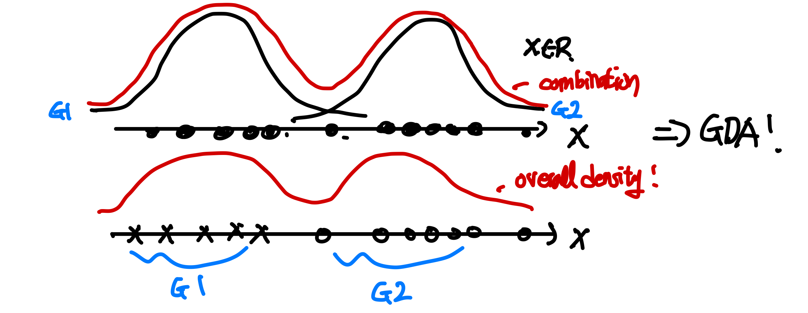 이해를 돕기 위해 1차원 예시를 들어보도록 하겠다! 아래와 같이 2개의 Gaussian distribution(G1,G2)가 겹쳐져 있는 overall density가 존재할 때 만약 각각의 점들이 어느 Gaussian distribution에서 왔는지 알고 있다면 GDA를 이용하여 모델을 학습시킬 수 있다. CS229 5. GDA & Naive bayes에 자세하게 나와있다