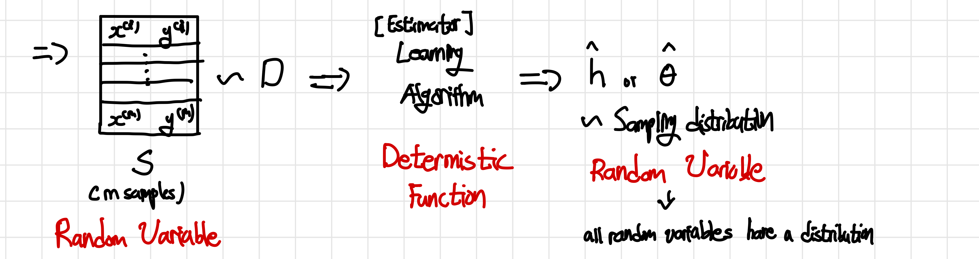 결국 이 data generating process에서 생각해볼 수 있는 것은 true parameter 과 가 존재할 것이라는 것이다 (Frequenist 의 관점! CS229 8. Data Splits, Models & Cross-Validation ) 이때 과 는 learning 알고리즘의 output이 되길 바라는 parameter로 실제로 무엇인지 우리는 알 수 가 없다. 또한 이 값들은 probability distribution이 없기 때문에 random variable이 아니라 constant이다.