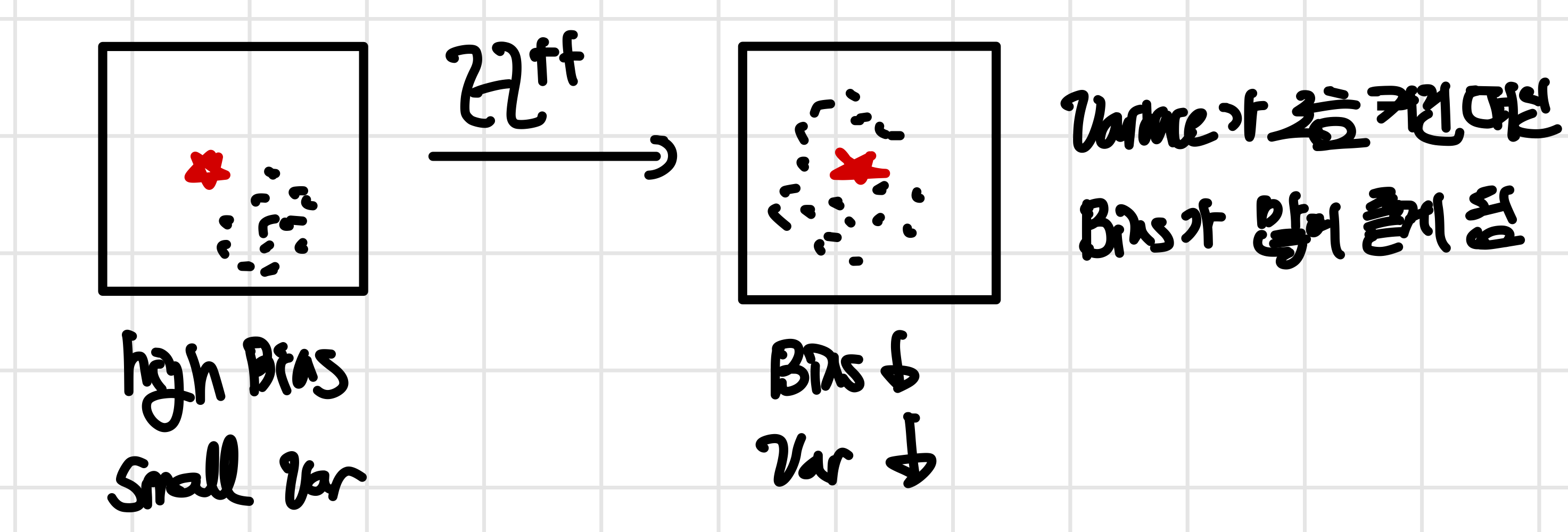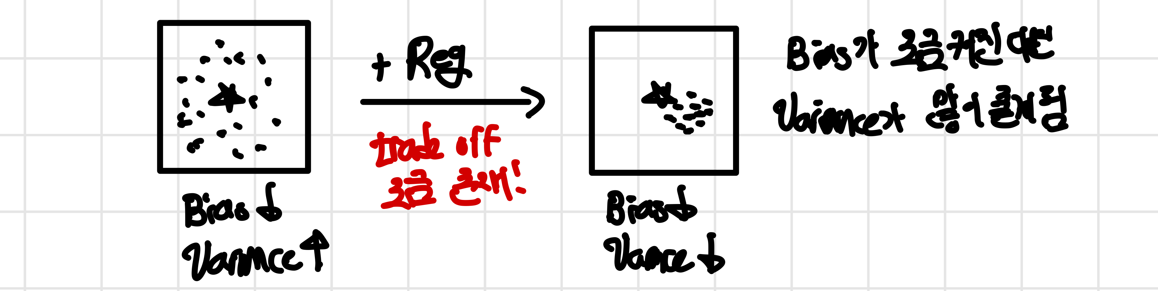 regularization을 통해 variance가 큰 경우의 penalty를 부여하여 varinace가 작아지도록 모델을 설계하는 방법이다. 다만 이럴 경우 bias와 trade off가 생기게 되는데 loss가 최소가 되지 않는 부분에서 최적의 값이 생기기 떄문에 true parameter와 조금 멀어지게 될 수 있다. 하지만 variance가 더 큰 비율로 문제가 된다면 bias를 조금 크게 만드는 대신에 variance를 많이 줄도록 만들어야한다.