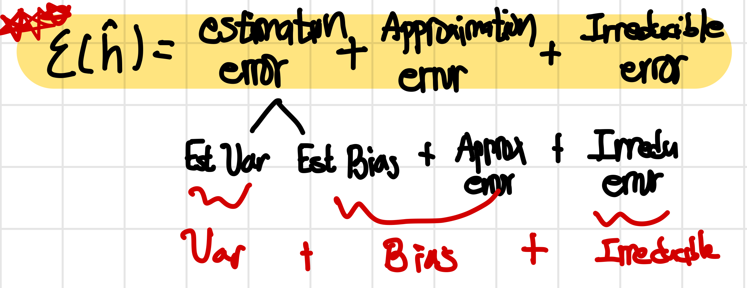 - ξ(g) : Bayes Error/ Irreducible Error best possible hypothesis가 error를 만들 확률! 아무리 best hypothesis라고 하더라도 0이 될 수는 없다 (error가 생길 수 밖에 없음 ex: x→ y1 값이 되기도 하고 x→y2 값이 되기도 할 때)