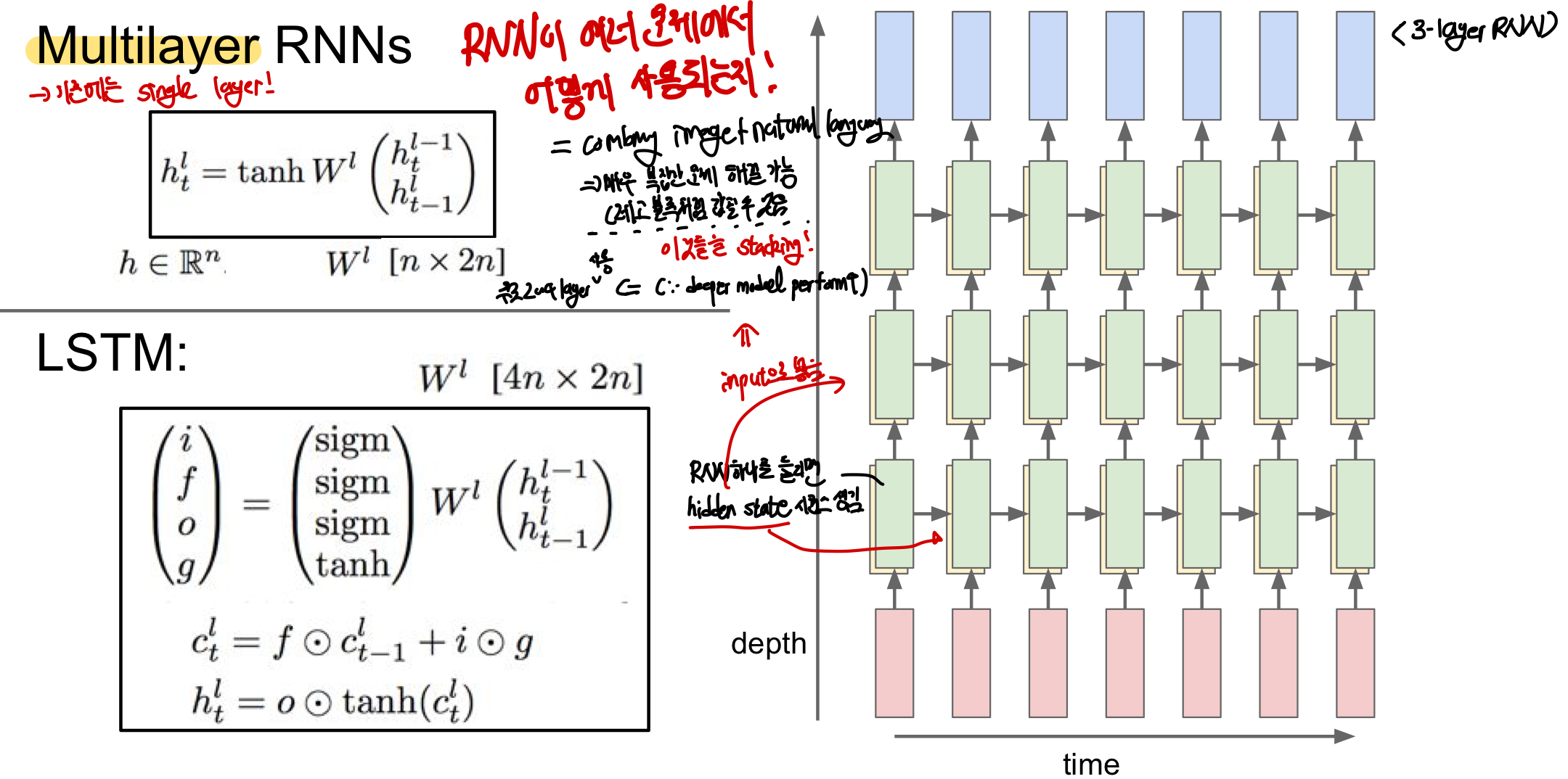 single layer을 사용하지 않고 주로 2~4개의 layer을 겹쳐 RNN을 구성한다