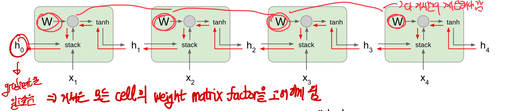 - RNN 특성상 이러한 sequence가 계속 반복되어 각 cell마다 weigh matrix factor을 고려해야함