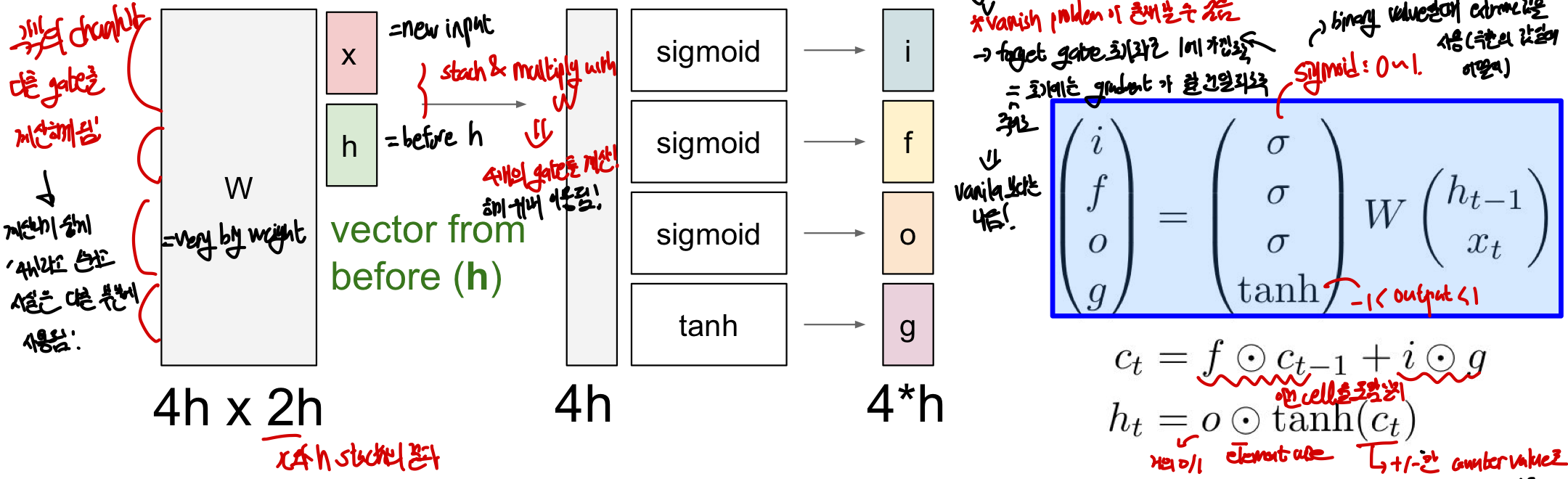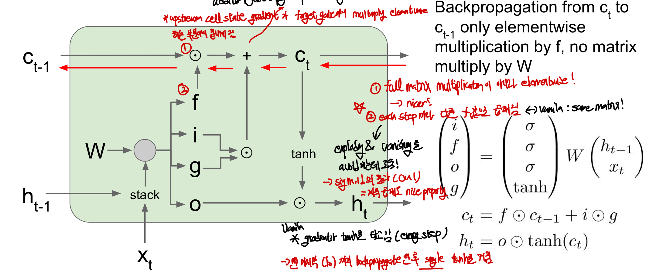 - each cell step마다 다른 f(forget gate)값으로 곱해지기 때문에 exploding과 vanishing 문제에 효과적! f의 값이 sigmoid의 결과이므로 0~1의 값을 갖고 계속 곱하더라도 nice property를 가짐