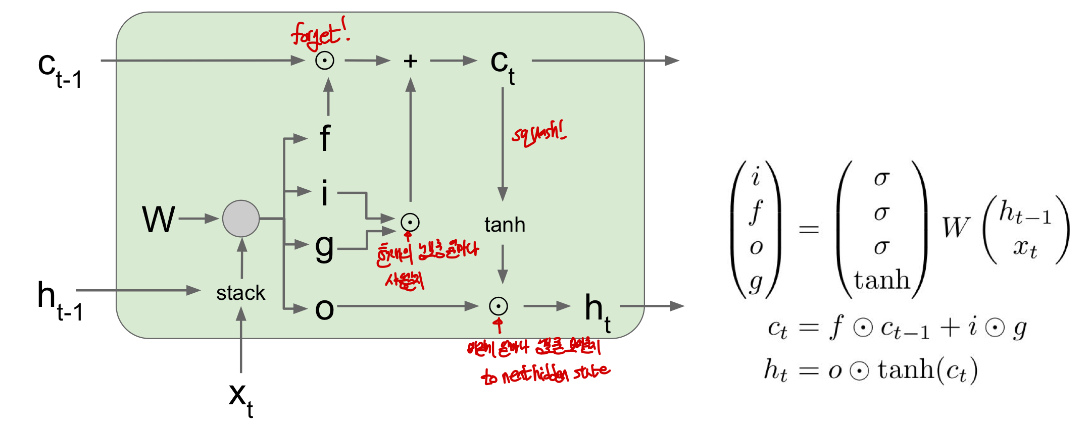 - f (forget gate) : 이전 Cell state를 erase할지를 결정(sigmoid : 0/1값)