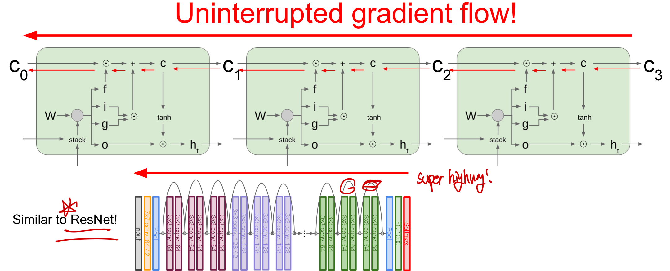 방해받지 않는 일종의 고속도로가 LSTM에서 만들어지며 이는 몇몇 layer 사이마다 값을 직접 전달하는ResNet 과 유사하다고 볼 수 있다.