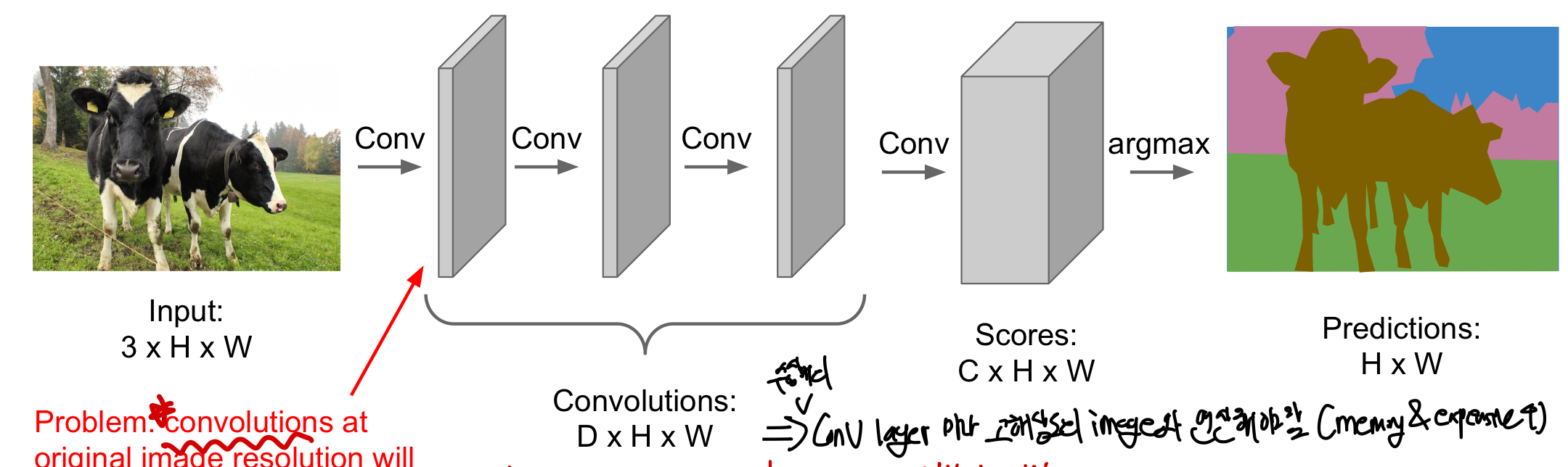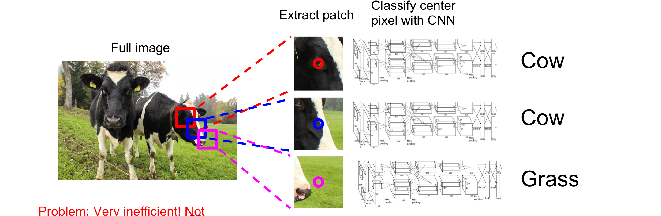 🤬 문제점: 매우 매우 높은 비용의 연산을 필요로 한다 ➡️ 모든 pixel 각각에 대해 label을 붙여야 하며 모든 부분 crop을 CNN에 학습시켜야한다. 또한 바로 이웃한 crop들에 대해 공통된 feature들을 다시 재활용하지 않기 때문에 매우 비효율적으로 학습을 할 수 밖에 없어 사용되지 않는 방법이다