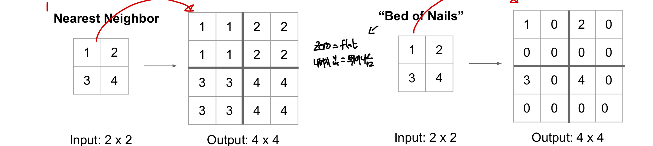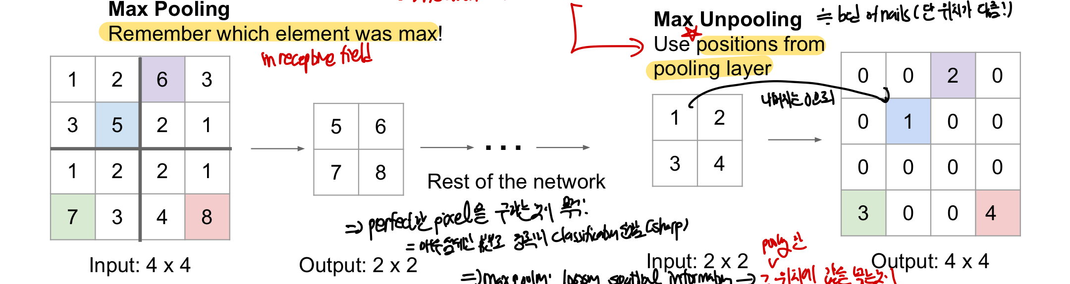 Nearest Neighborhood Unpooling: 같은 값이 확장된 영역에 그대로 들어가게 됨Bed of Nails Unpooling: 가장 왼쪽 상단에 입력 값이 확장된 영역에 그대로 들어가고 나머지는 0이 됨⭐️ Max Unpooling: max pooling을 진행할 때 max인 곳의 위치를 기억했다가 unpooling때 그 자리에 unpooling이 되는 값을 넣는 방법- 위치를 기억함으로써 max pooling을 통해 잃어버린 공간적 정보를 다시 가져오며 각 픽셀이 어떤 class인지 구하는 문제인 만큼, 최대한 완벽하게 픽셀이 어떤 class인지 학습하기 위한 디테일을 추가해주는 이점을 제공한다.