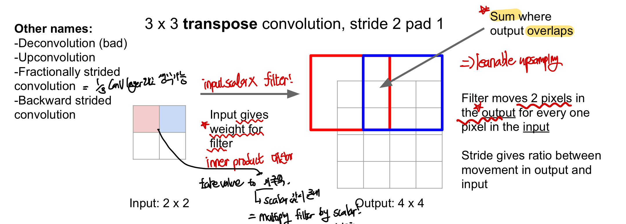 downsampling하는 방법과 반대로 기존의 값을 weight와 연산을 하여 upsampling이 되므로 학습이 가능한(weight가 존재!) upsampling이라고 불린다!