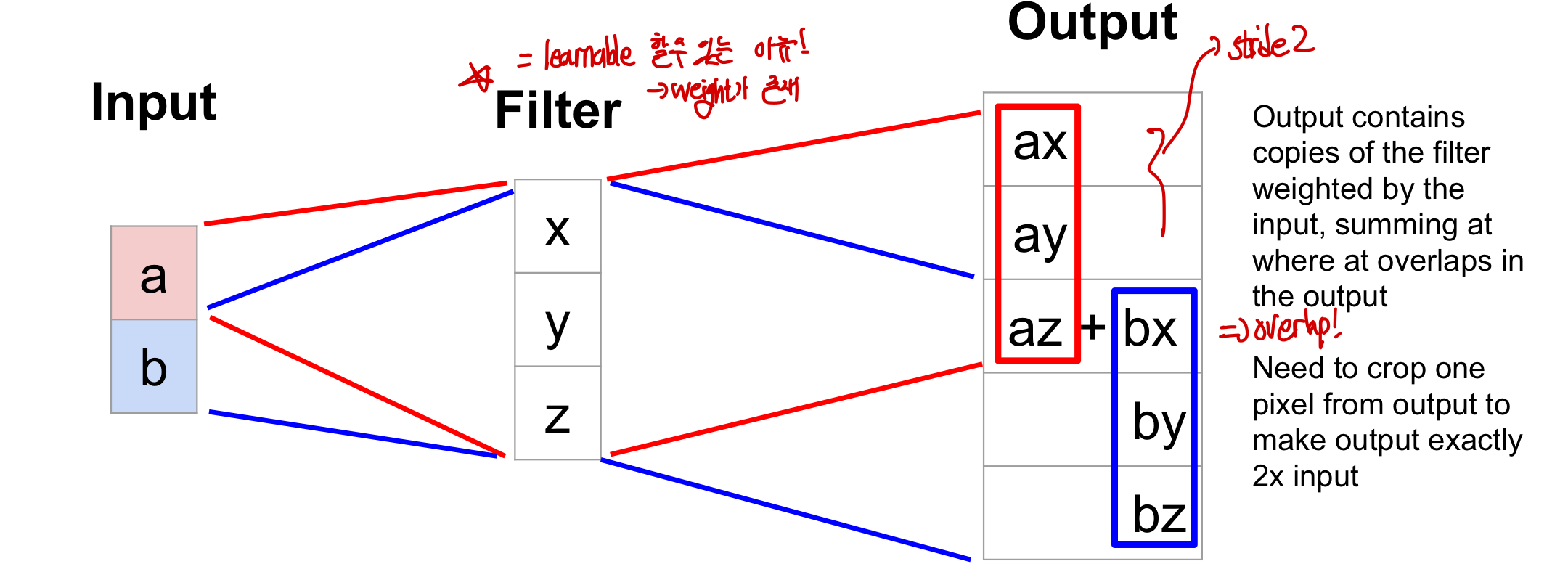 Transpose Convolution에서는 convolution에서와 반대되는 현상이 일어나며, 반대로 생각을 하면 된다. 이때 stride가 1일 때를 예시를 들면 vector들은 다음과 같은 의미를 갖는다