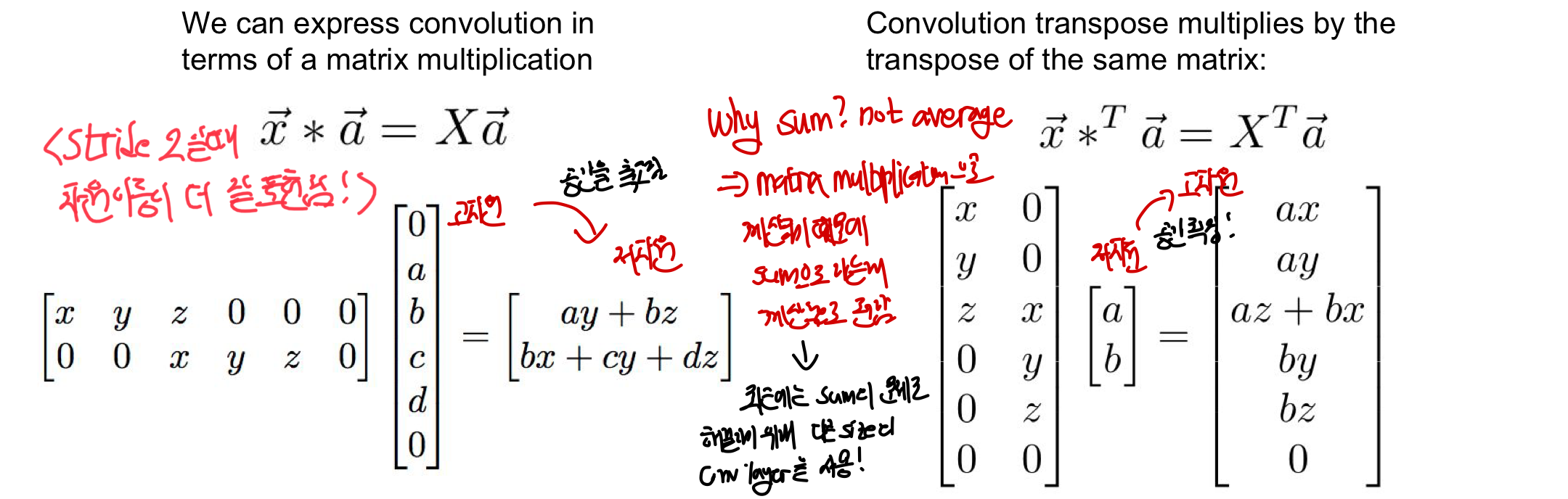 위에서 output들이 겹치는 부분을 단순히 더한(sum) 다고 했는데 그 이유가 바로 Linear Algebra 4. Matrix multiplication 의 결과가 average가 아니라 sum이기 떄문임