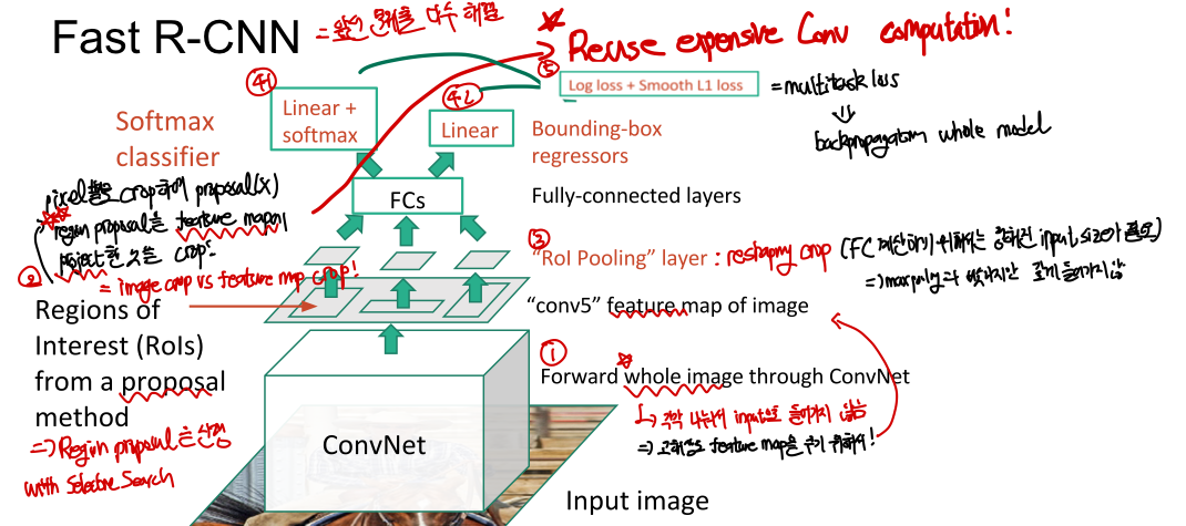 - 전체 image가 CNN에 입력으로 들어간다 : 이후 CNN을 통과하며 feature map을 구하며 (여기서는 conv5의 feature map 사용) 이는 image의 각 부분을 나누어 CNN의 입력으로 넣는 R-CNN과 구별되는 특징이다
