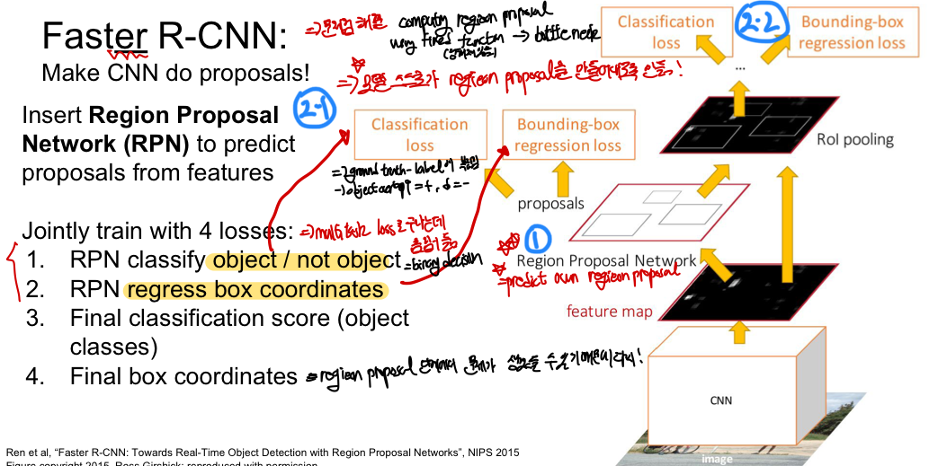 faster_R-CNN 즉, 기존의 문제점은 region proposal을 계산하는 과정에서 bottleneck이 생기게 되는 것이었는데 이를 모델 스스로가 region proposal을 생성할 수 있도록 만듦으로써 해결한다!