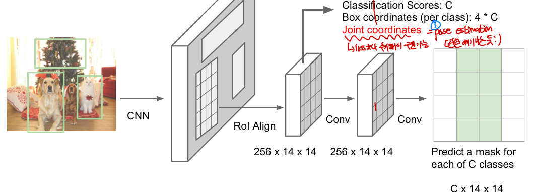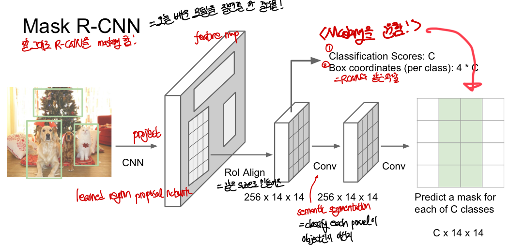 R-CNN) - Conv layer을 거쳐 region proposal에 대해 여기에 들어가있는 각 pixel이 어떤 class에 들어가는지를 masking한다 (