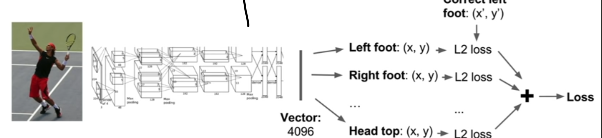 관절의 수가 같은 수로 정해져있다고 가정하여 각 관절이 어디에 위치해있는지에 따라 사람의 형상을 추측할 수 있는 방법이다. 먄약 14개의 관절들을 이용해 형상을 예측하고자 한다면, 14개의 box coordinate를 regression의 방법으로 학습시켜 각 관절이 어디에 있는지를 학습한다. 다만 이런 classification + Localization 방법은 고정된 output의 개수를 알고 있을 때만 유용하게 사용할 수 있다.