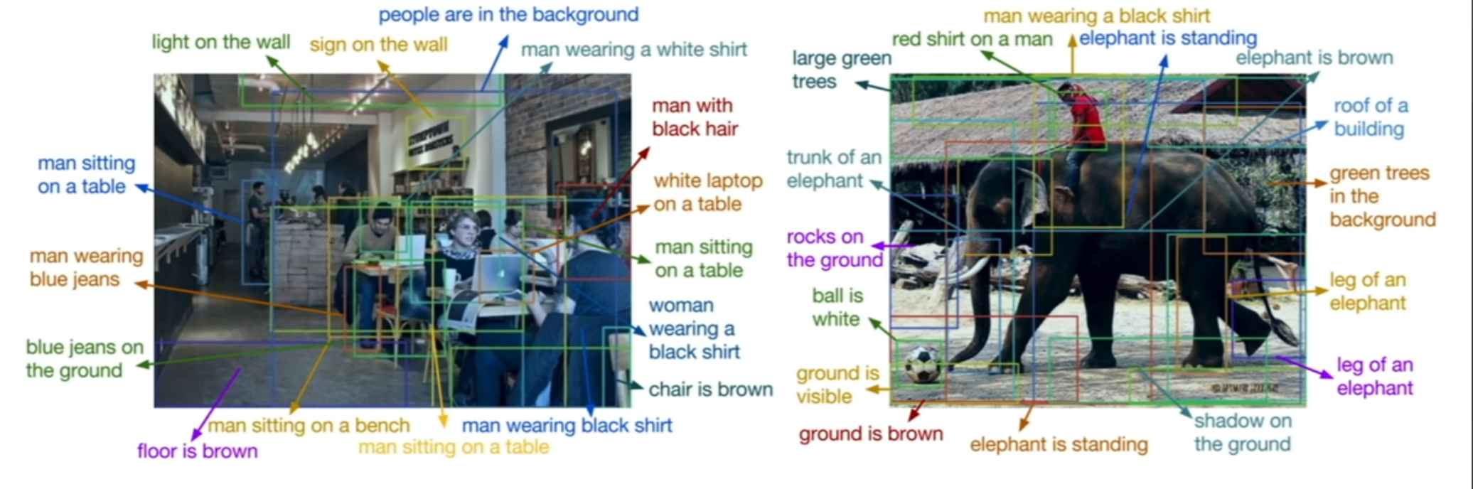 각 region마다 caption(설명)을 다는 network로 faster R-CNN을 통한 object detection 후 각 region마다 class score을 내지 않고 중간에 다른 layer을 RNN 모델과 연결하여 설명을 만들어내는 방법이다. CS231n 10-1. Recurrent Neural Networks(Single RNN) 이런 방법과 같이 여러 computer vision 분야들을 서로 섞어서 새로운 작업에 활용이 가능하다.