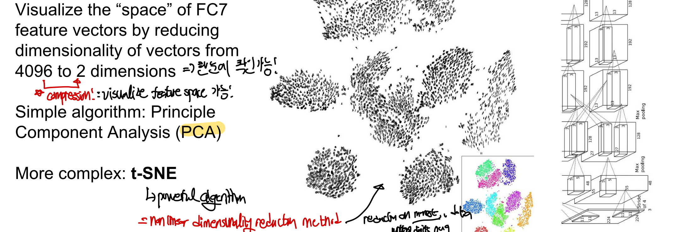마지막 layer의 4096dim feature vectore을 2차원으로 압축하여 feature space를 visualize 가능!