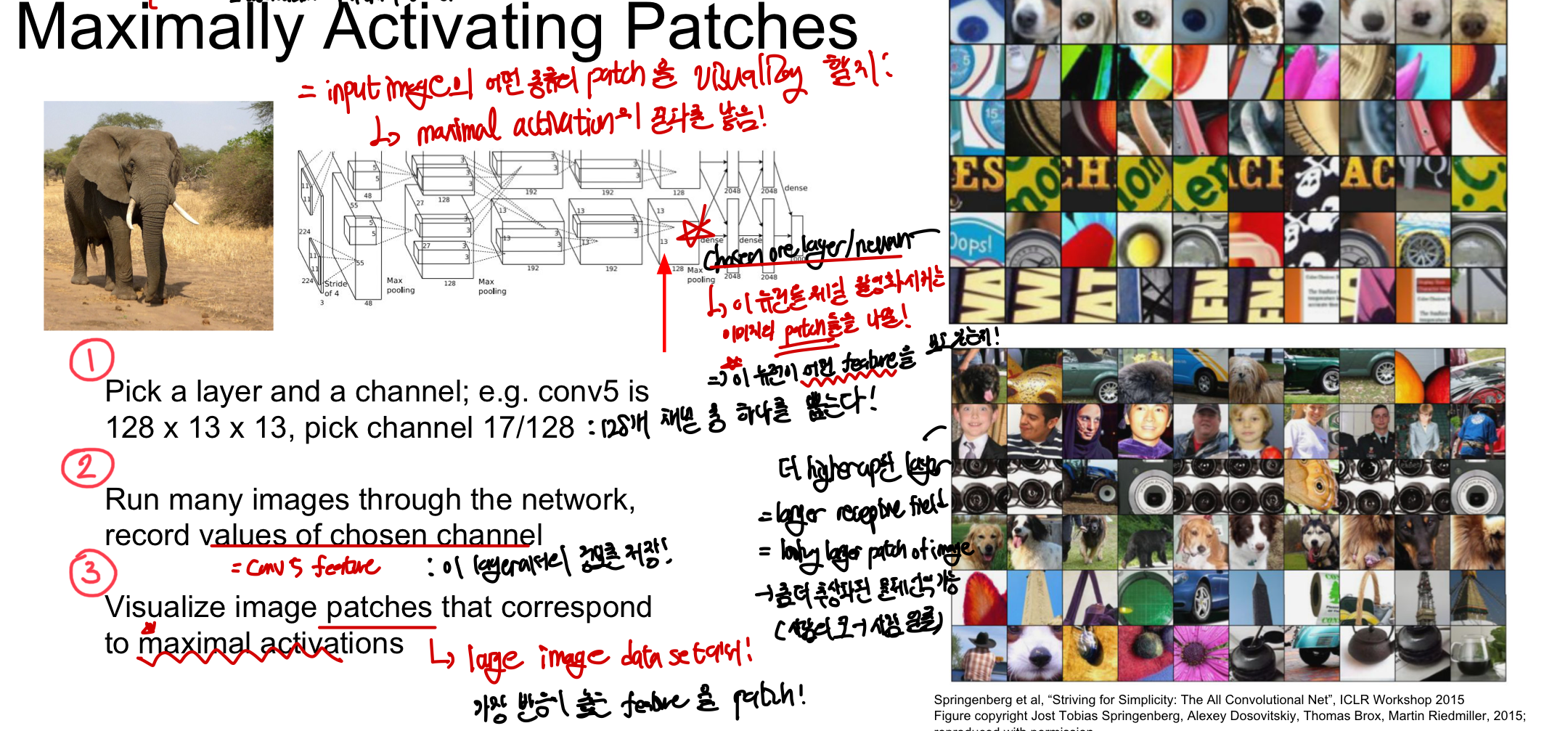 - 즉, maximal activation을 보이는 image patch 부분을 input image set에서 그 patch 부분을 가져와 시각화해서 어떤 feature을 보고 있었는지를 알 수 있게 만드는 방법