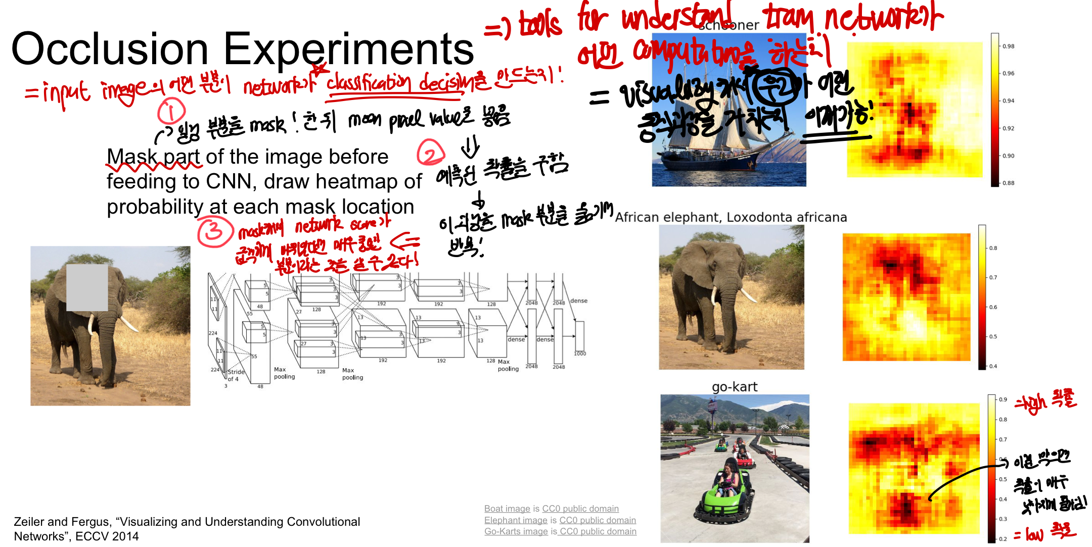 input image의 어떤 부분(pixel)이 network의 classification decision을 중점적으로 영향을 미치는지를 알아봄!(by masking with mean pixel value)