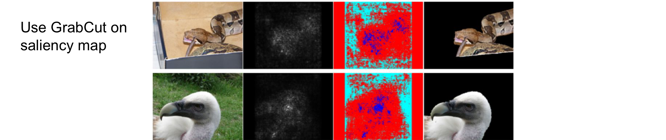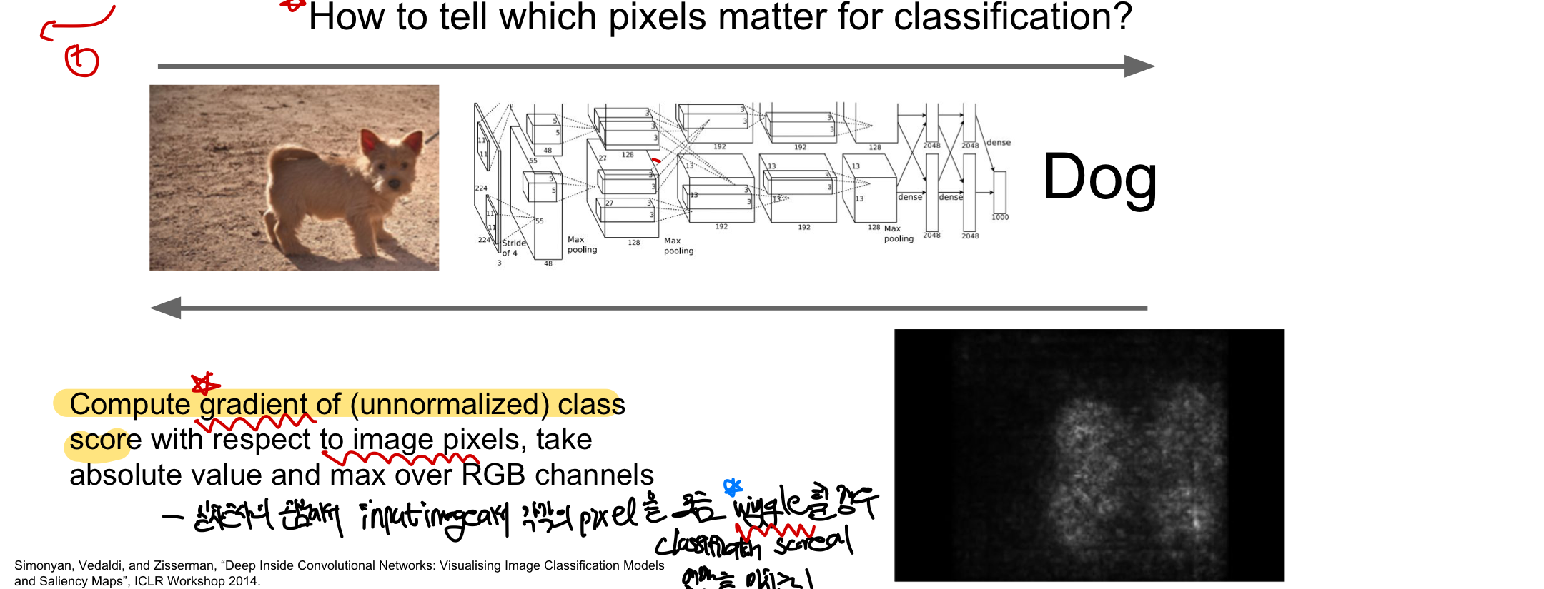 어떤 pixel이 classification problem에 중요한 역할인지 알아보는 것!(by gradient with pixel값 wiggle) image pixel에 대해 class score의 gradient를 계산해서 이를 visualize함! - 일차근사 관점에서 input image에서 각각의 pixel을 wiggle(조금 움직임)할 경우 classification score에 어떤 영향을 미치는지 확인 - 주로 image에서 중요한 feature이 object가 될텐데, 이 방법을 통해 시각화하면 일종의semantic_segmentation 이 가능함CS231n 11. Detection & Segmentation - data를 label하지 않아도 물체의 형태를 알아낼 수 있지만 성능이 그렇게 좋지 않음 - 특정 알고리즘과 연결하면 object segment 가능