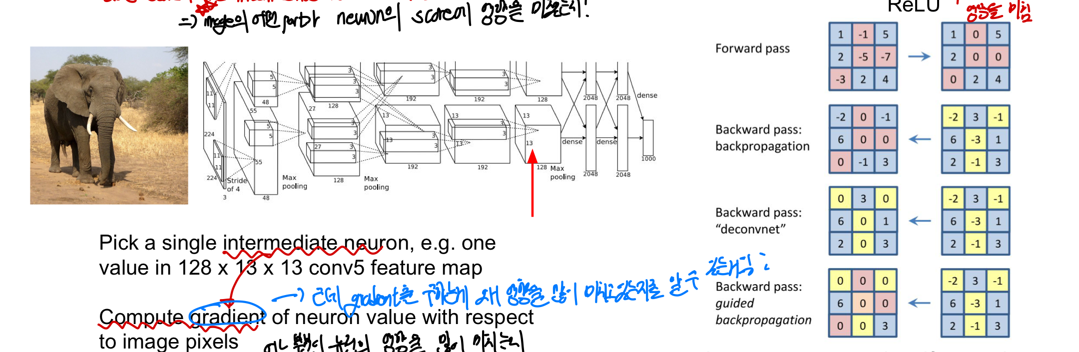 - intermedate neuron 값이 maximize하게 만들어주기 때문에 어디를 보고 있는지 확인 가능!