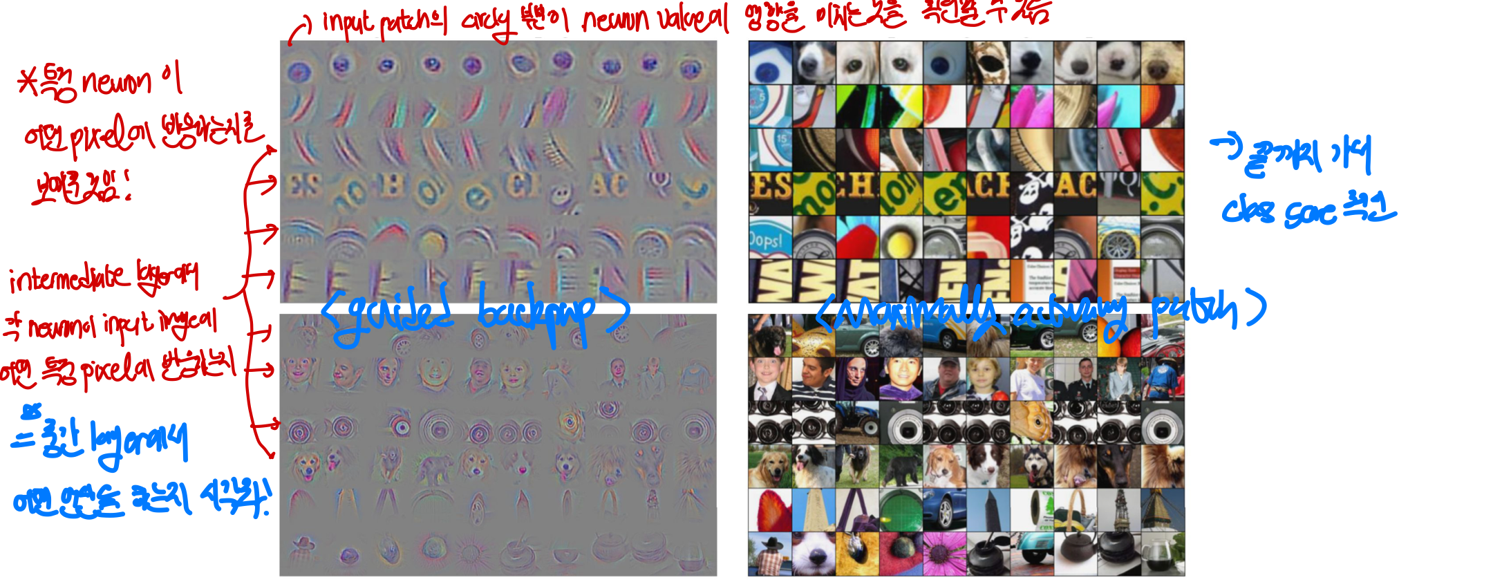 ←> class score가 아닌 intermediate neuron을 뽑음! : 밑에 사진에서도 중간 layer에서 어떤 pixel을 보고 있는지 시각화해주고 있음