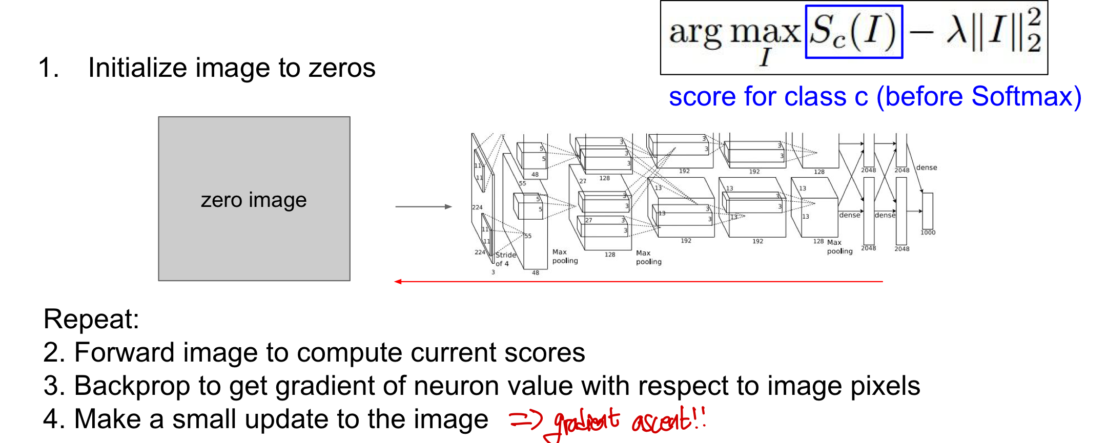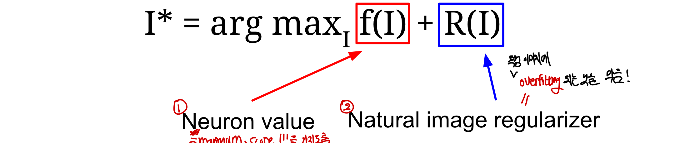 neuron을 maximally activate 시키는 synthetic image(합성된 새로운 이미지)를 만들기 위한 방법!