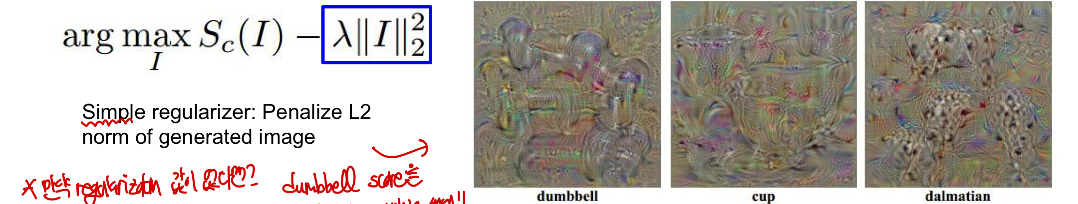 - 즉, 특정 물체(ex:덤벨)의 score을 최대화시키는 이미지를 생성하고 이떄 regularizer 영향으로 natural한 image가 생성되는 것임!!