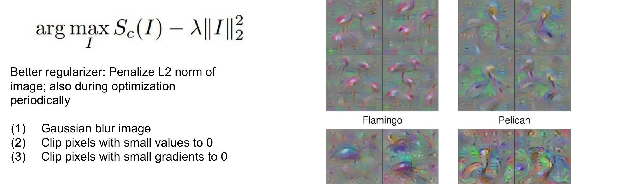 - 특정 하나의 물체만 얻는 것이 아닌 (Gradient ascent regularizer에서 아령으로 이루어진 사진) layer에 있는 모든 뉴런들을 amplify했기 때문에 각양각색의 물체를 얻게 됨