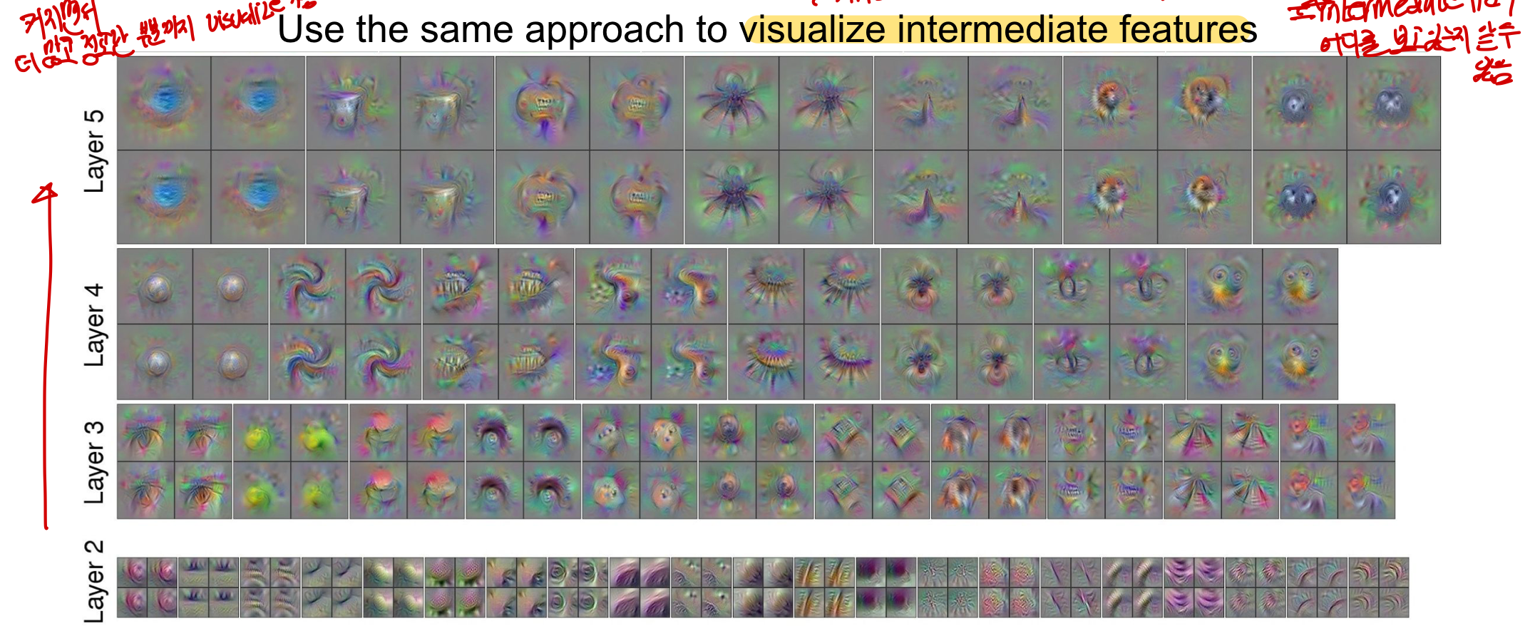 image를 sliding하면서 inner product한 값이기 때문에 filter가 무엇을 보고 있는지 감각을 얻을 수 있음 - filter의 learned weight를 시각화한 결과 - wx(weight와 input data의 내적)을 통해 filter 값이 정해지는데 내적할때 maximally activation하게 만드는 것이 weight! 그렇기 때문에 이 weight를 visualizing하여 이해가능! 하지만 2번째 layer부터는 1번째 layer의 각 부분이 어떤 것을 의미하는지 알 수 없기 때문에 무엇이 2번째 layer값을 maximally activate하게 만들었는지모름 - 즉, maximally acivation하게 만든게 weight가 아니기 떄문에 시각화해도 알기 힘듦(activation pattern을 모름!) - weight를 보고 알 수 있는 것이 많지 않기 때문에 바로 image로 바꾸기 힘듦 - 직접 input image에 연결되어 있지 않기 떄문에 좋은 직관을 주지 못함