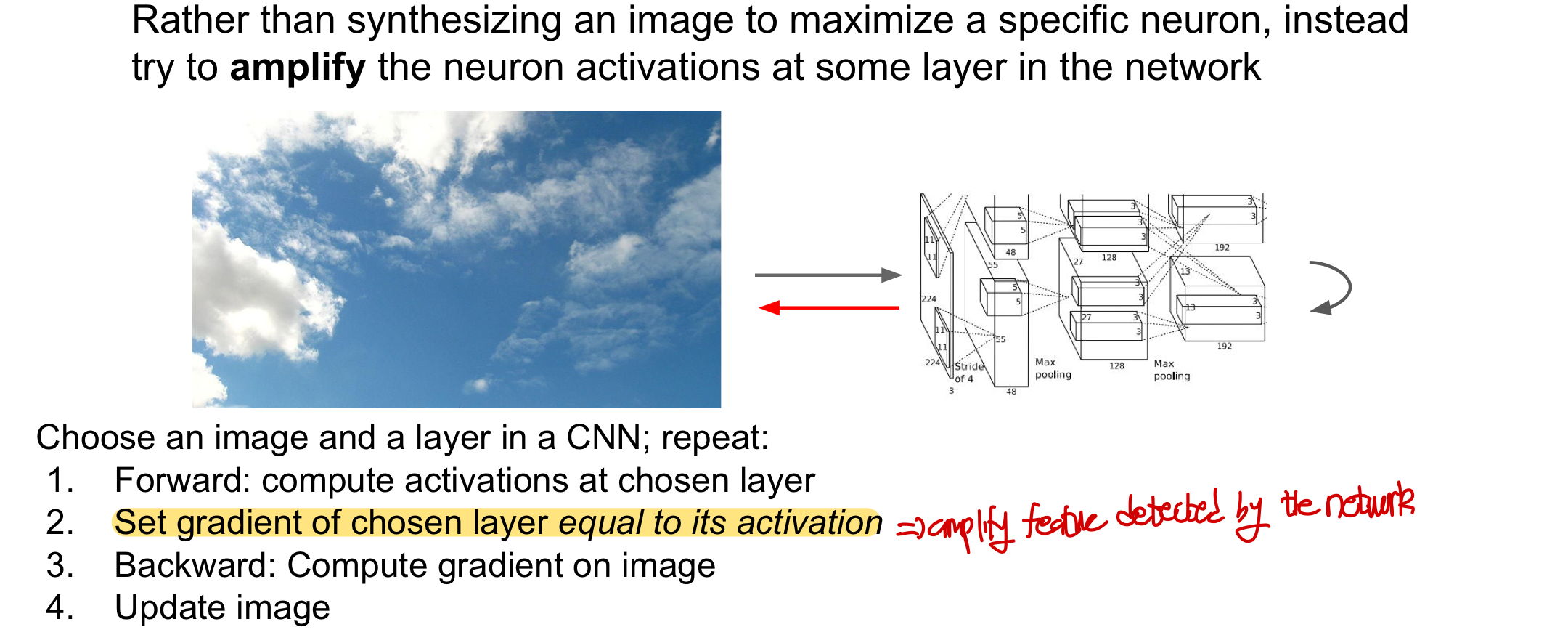 - 이전에는 특정 neuron(양수의 gradient를 가지는 뉴런)을 최대화시켰다면 지금은 neuron activation을 증폭시킴(모든 뉴런값을 확대)!