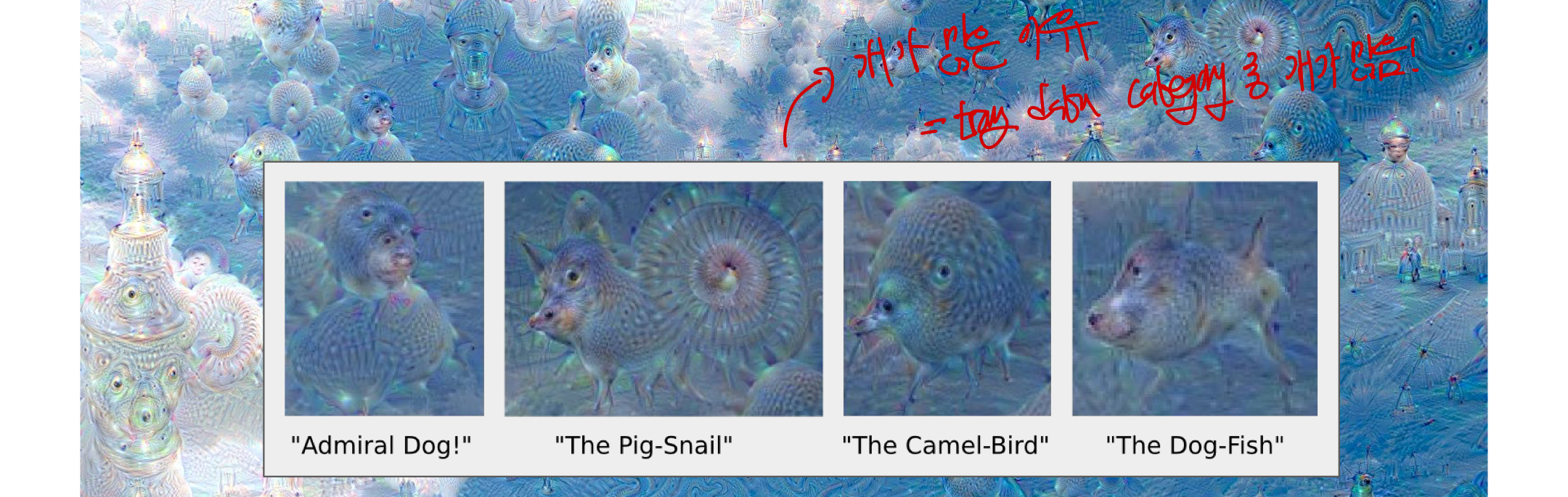 특정 layer을 선택해서 계속하여 이 layer의 모든 뉴런 값들 amplify하여 계속 학습시켜 visualize한다면 별의 별 그림들이 합성된 그림들을 얻게 됨