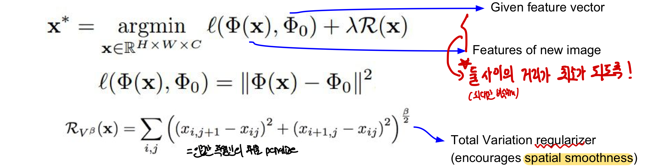 이미지에 대해서 CNN을 통과한 후의 feature vector을 받아 feature vector과 일치하고 자연스러운 새로운 image를 찾음