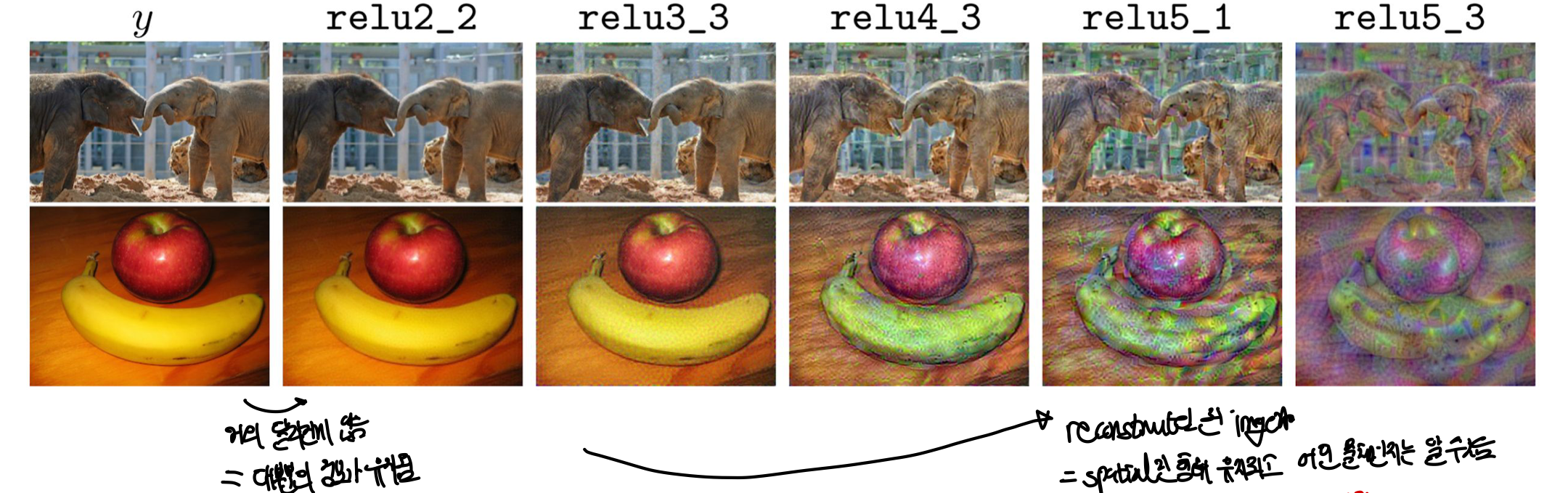 - 즉, 깊은 layer의 feature map은 더 요약되어있고 중요한 정보만 가지고 있기 때문에 이 feature map과 유사하게 만든 image 역시 중요한 정보만 남긴채 detail이 떨어지게 됨