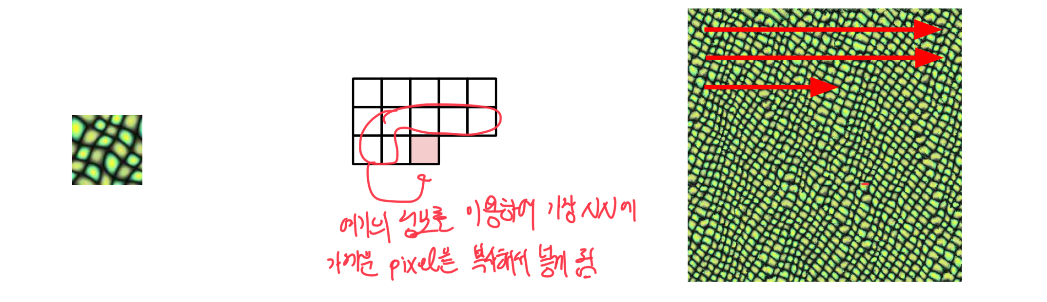 픽셀이 line을 훑어가며 이미 생성된 주변의 pixel들을 계산하여 그 자리에 들어갈 NN pixel을 복사하는 방식!