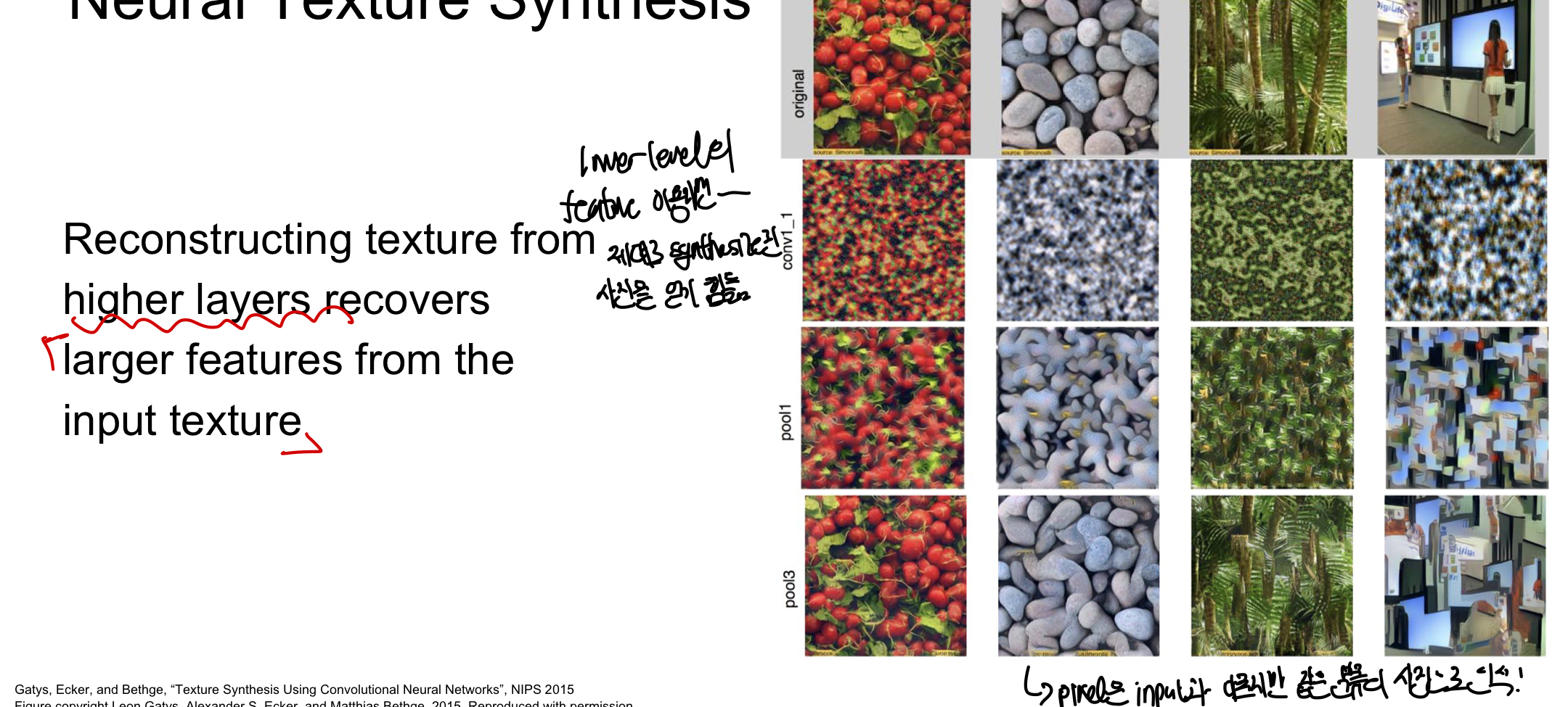 결과적으로 lower level layer의 feature을 이용하면 제대로 synthesized된 사진을 얻기 힘들지만 더 깊은 layer의 feature일 경우 input texture의 더 넓은 범위의 feature들을 담아 실제 input과 pixel은 다르지만 같은 분류의 사진(texture)로 판단하게 됨!