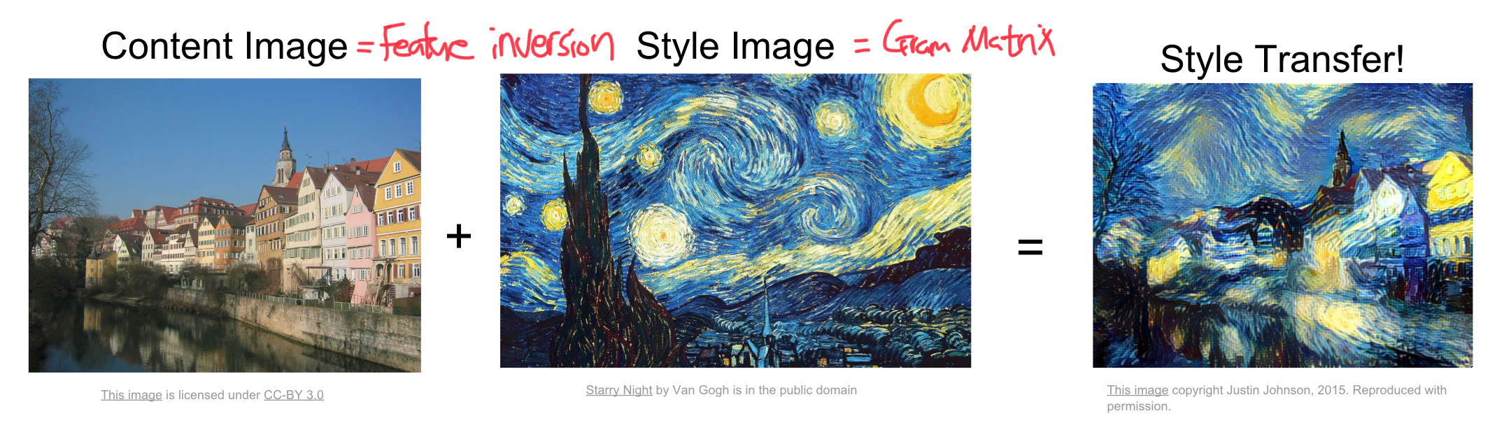 gram matrix(질감에 대한 정보를 얻어 질감을 바꿀 수 있음) + feature inversion(그림의 주요형태만 남김)