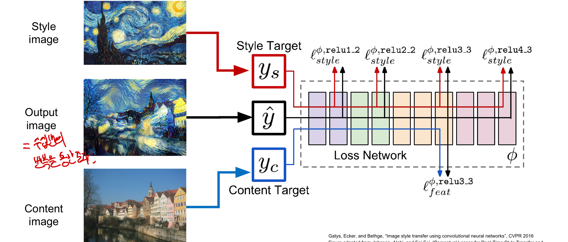 style image를 고정시키는 후 content image만 입력을 받아 결과를 출력할 수 있는 network를 학습시키는 방법!