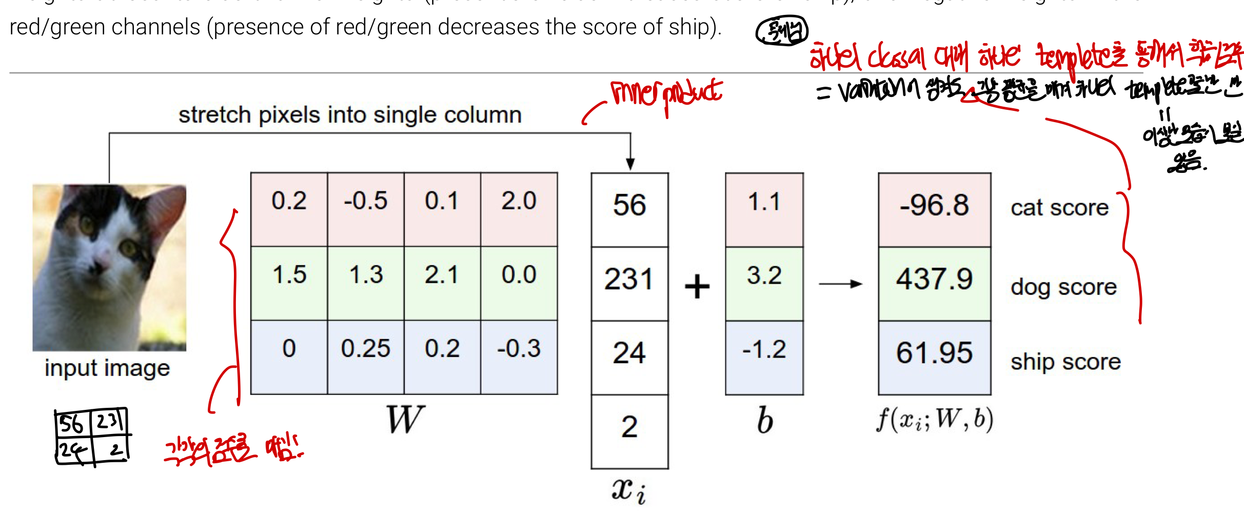 - : 이 parameter/ weight를 이용해 score function을 만들어 특징들을 구별하게 만듦(즉, 값을 바꾸면서 학습이 가능함!) 즉, 각 픽셀의 특징이 특정 class와 얼마나 유사한지를 W에 넣어주고 +/-의 가중치를 이용하여 계산을 하면 됨(해당 사진이 고양이임에도 W가 고양이의 특징을 학습하지 못해 class 분류를 제대로 못하고 있으므로 W를 매우 안좋은 편이라고 생각할 수 있다.)