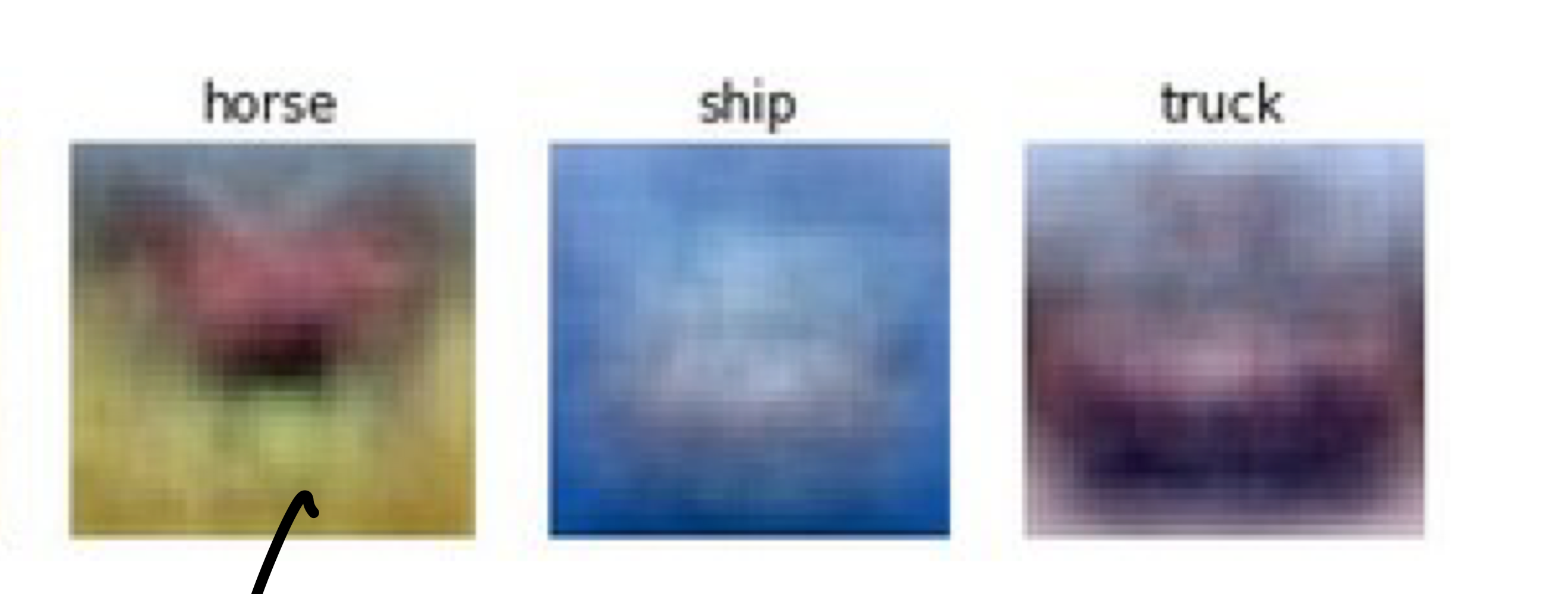 - 여기서 W의 차원(dimension)은 class의 개수에 의해 결정됨 variation이 생겨도 평균을 매겨 하나의template 으로만 만들게 됨(이상한 모습이 보일 수 있음)
