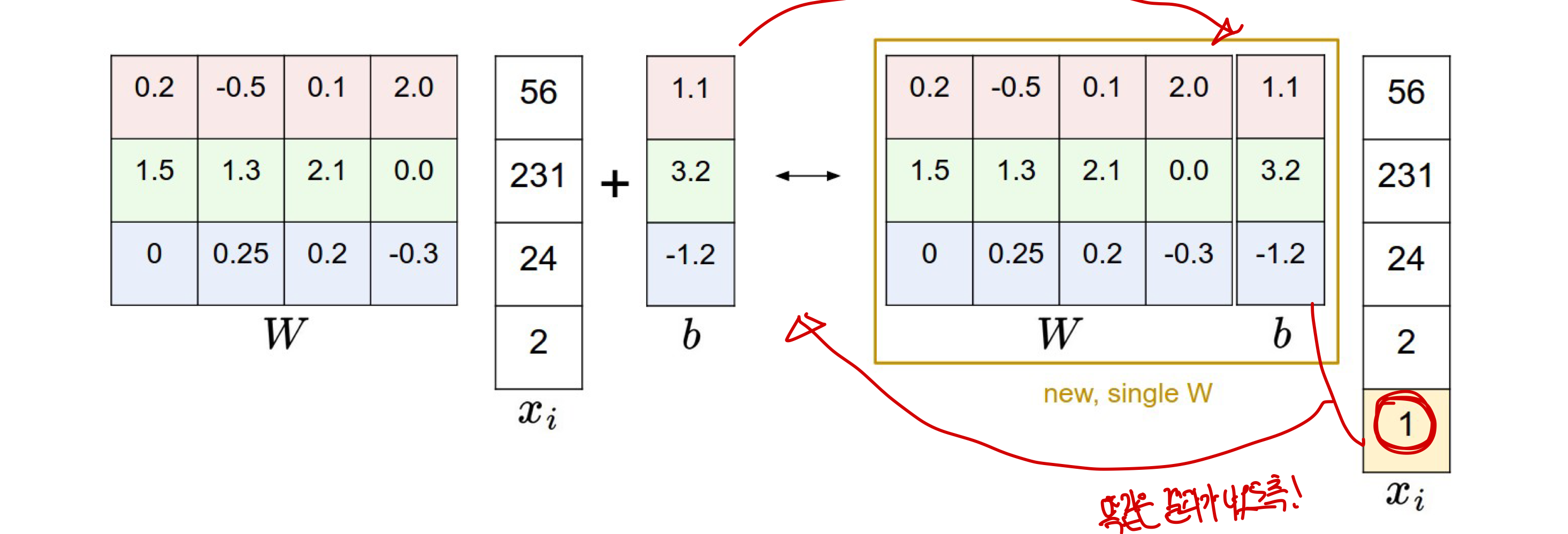 bias인 b를 W에 추가하고 xi 열 백터 마지막에 1을 추가함으로써 더 간단하게 표현이 가능하다.