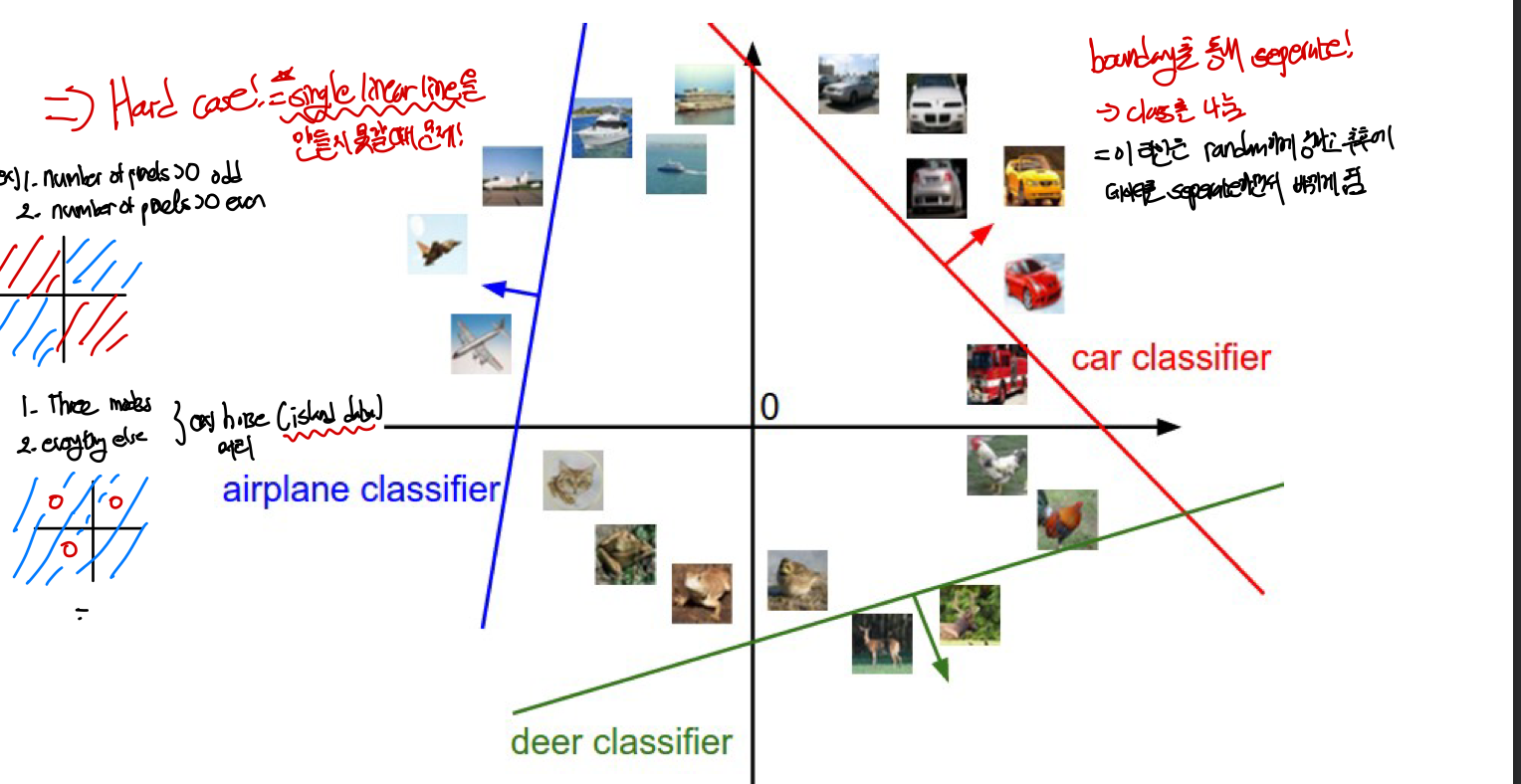 각 class score는 이 고치원 공간 상에서 선형함수값으로 표현이 되어 class에 대한 score을 이미지의 모든 픽셀에 대한 가중치의 합으로 정의힌다. 그래프 상에서의 선(boundary)이 곧 각 class의 class score가 0이 되는 지점을 뜻하고 W는 학습이 끝난 뒤에는 정해져있는 값이기 때문에 2차원이라고 생각해봤을때 직선(boundary)하나로 class score가 0인 곳을 알 수 있으며 이보다 크면 positive score 값(이 image가 이 class에 속한다!)을 얻는 것을 알 수 있다. 주로 이러한 boundary를 통해 separate하는데 맨처음에 random하게 정하고 나중에 바뀌게 된다. 즉, 이미지를 고차원상에서의 점으로 표현할 떄는 boundary(선형함수로 표현된 score function) 정하는 것이 곧 W를 정하는 것과 같다고 볼 수 있다.