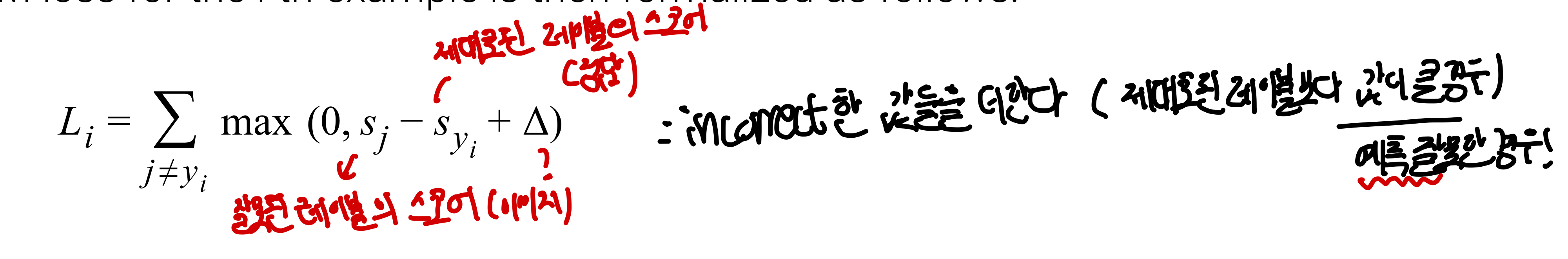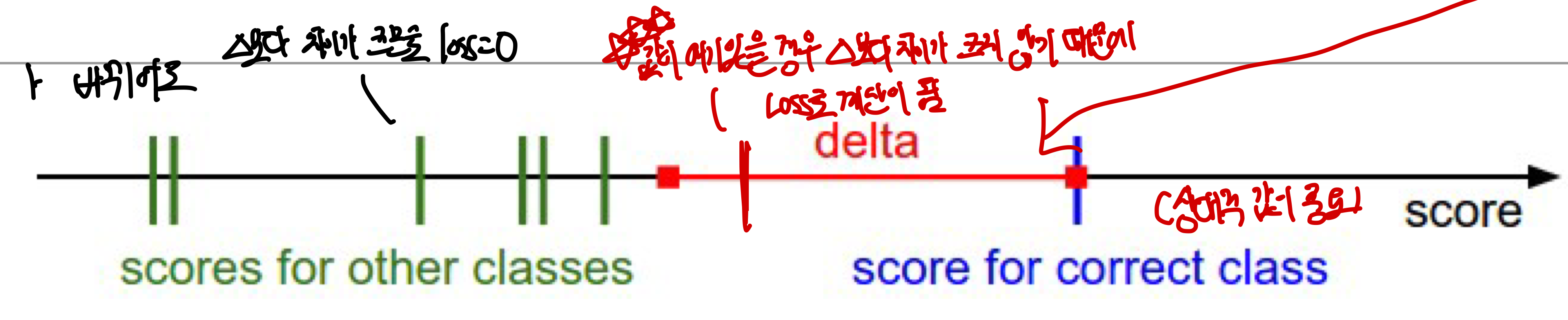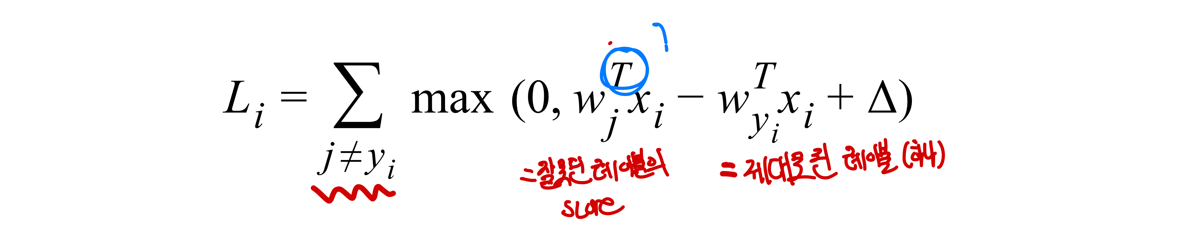 즉, (다른 class의 score)+< (맞는 class의 score) 이어야 Loss가 생기지 않음 - : 잘못된(정답이 아닌) class의 score