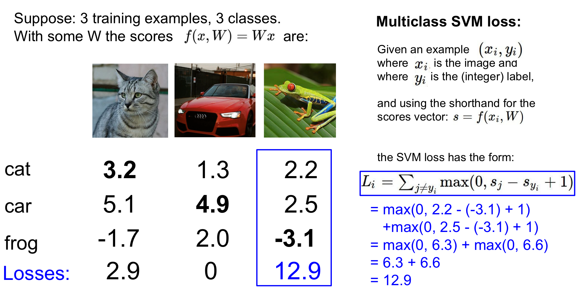 - , 고양이의 경우: 인 것을 알 수 있는데 loss가 없기 위해서는 다른 모든 class의 값들이 2.2이하여야 한다. 하지만 car의 점수 5.1점이기 떄문에 loss가 발생하고 loss를 구해보면 임을 알 수 있다.