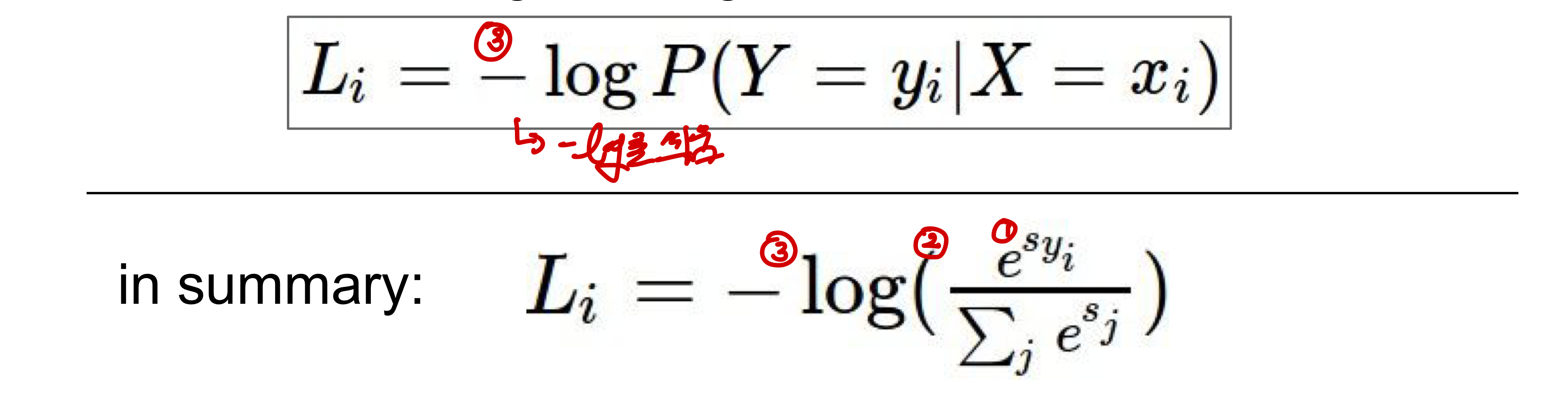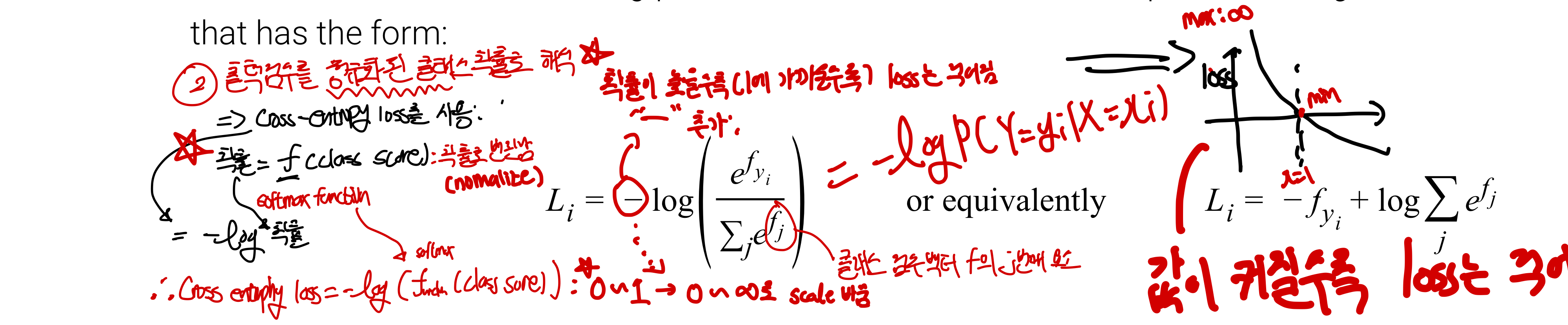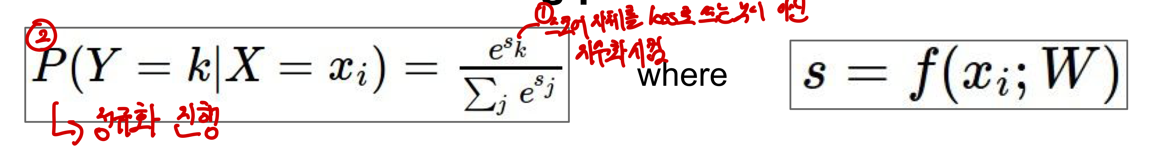 score: unnormalized log probability => unnormailized probability➡️주어진 데이터에 대한 상대적인 확률을 log라는 이름을 이용해 표현한 거임! - 정규화 진행 : 모든 점수의 합으로 각 점수를 나누어 정규화시키고 이를 통해 class score을