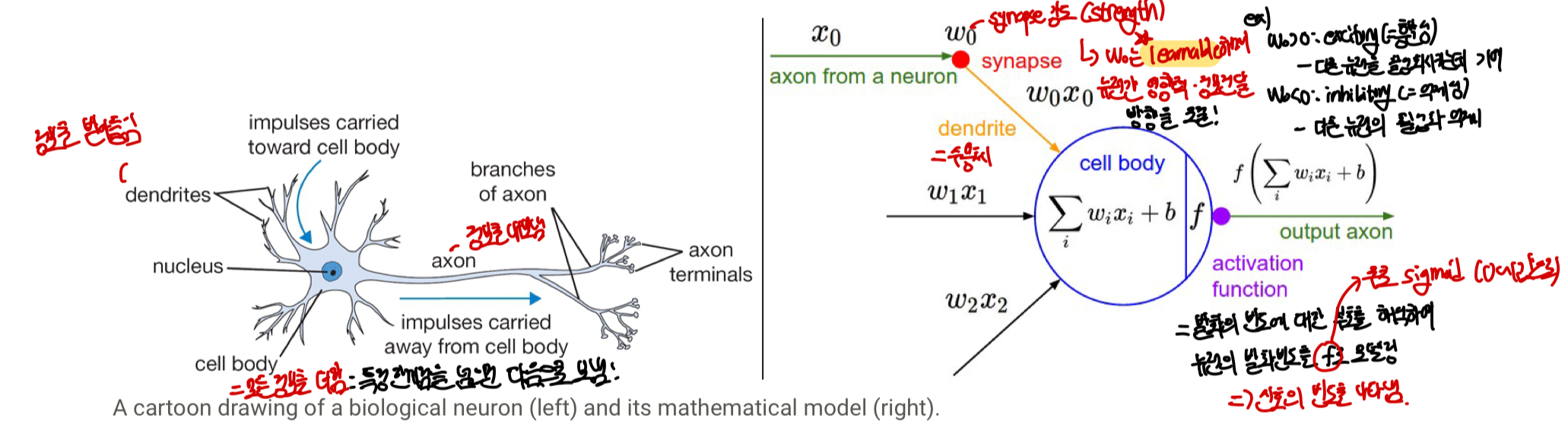 - 앞쪽 layer의 axon에서 보낸 정보()를 synapse(: 고유의 값으로 학습 가능함=synaptic strengths)를 통해 받아 dendrite가 cell body에서 이 정보와 강도를 곱해 () 특정 값을 만들어내게 된다.