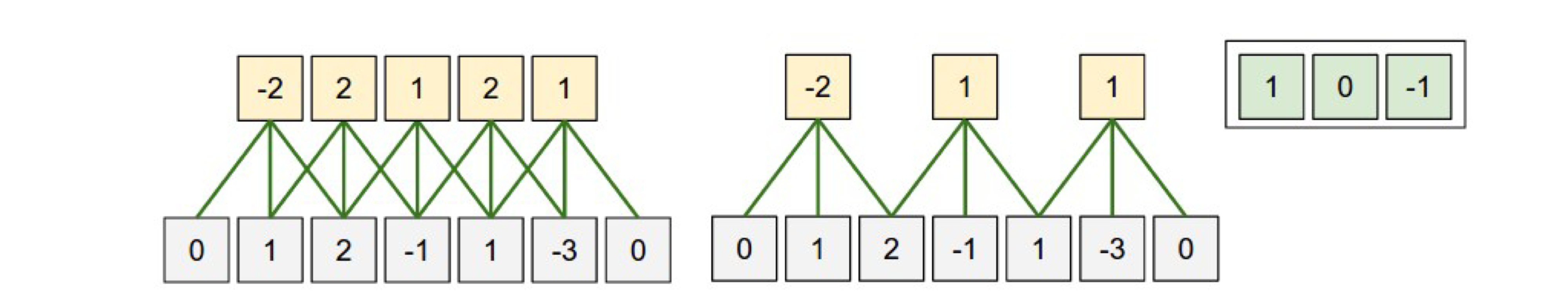 - stride: filter을 slide하는 정도를 정하는 것으로 이때 input에 따라 가능한 stride가 정해져 있다.(stride만큼 움직였을 때 input이 남거나 가지 않은 부분이 있으면 안됨)